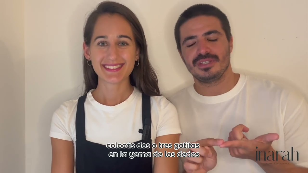 Es importante rebajar los aceites esenciales con algún aceite de base para poder colocarlo sobre la piel. Elegimos el de almendras porque ayuda a mantener la humectación y suavidad de la piel.